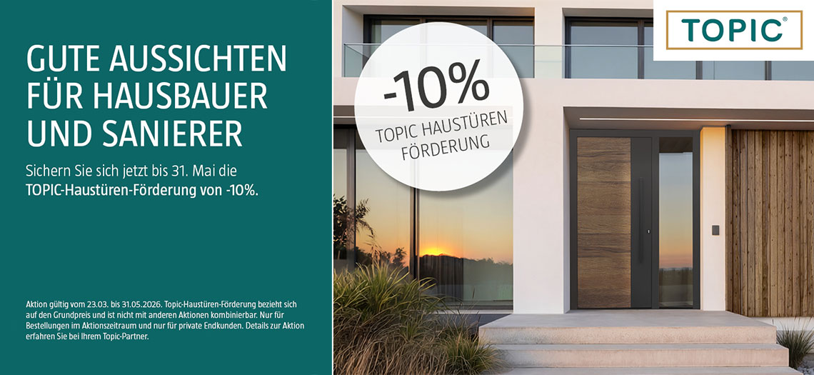 Aktion gültik vom 23.03. bis 31.05.2026. Topic-Haustüren-Förderung bezieht sich auf den Grundpreis und ist nicht mit anderen Aktionen kombinierbar. Nur für Bestellungen im Aktionszeitraum und nur für private Endkunden. Details zur Aktion erfahren Sie bei Ihrem Topic-Partner.